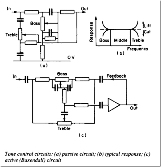 The input stage is usually followed by tone controls. These are typically some form of bass/treble lift/cut circuit. A typical passive circuit is shown over in (a), along with an active circuit using negative feedback in (c). These have the basic response of (b).