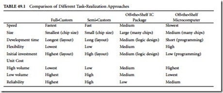 As discussed so far, we have a very wide spectrum of different design approaches, from full-custom design approaches to the design approaches with off-the-shelf packages, as illustrated in Table 49.1. Digital systems can be designed by combining them. Depending upon different criteria imposed by different design motivations, such as speed, power consumption, size, design time, ease of changes, and reliability, designers can use the following approaches: