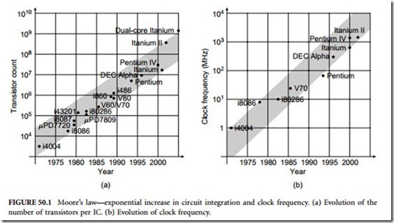 approximately every 18 months, and this doubling in size has been accompanied by a similar exponential increase in circuit speed (or more precisely, clock frequency). These trends of steadily increasing circuit size and clock frequency are illustrated in Figure 50.1(a) and Figure 50.1(b), respectively. As a result of this revolution in semiconductor technology, it is not unusual for modern integrated circuits to contain hundreds of millions of switching elements (i.e., transistors) packed into a chip area as large as 500 mm2 [3–6]. Such technological capability is due to advances in both design methodologies and physical manufacturing technologies. Research and experience demonstrate that this trend of exponentially increasing integrated circuit-based computational power will continue into the foresee- able future.